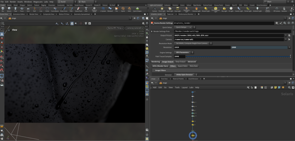 - You can now render water droplets with caustics using Karma XPU for a more realistic look (new nodes and settings are added in Solaris).